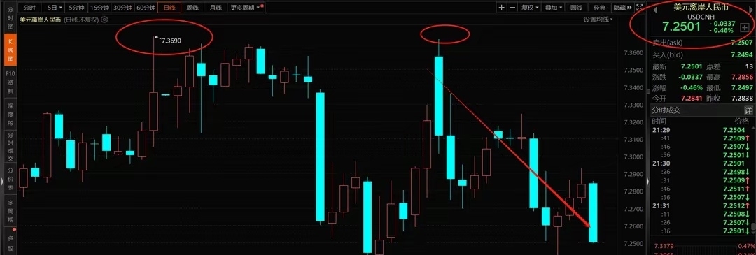 (2)二是从汇率市场的表现来看,晚上人民币汇率出现了大幅的升值,已经回到了7.25附近,对应的美元指数则是下跌至106附近。
