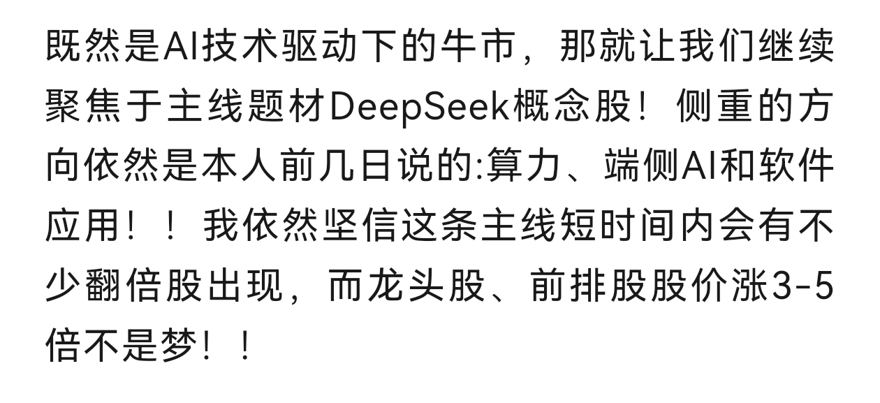 春节后,如果你每天有看我发表的文章,并且按照本人的观点去做,聚焦于主线题材DeepSeek概念,做其产业链上的相关个股,其实你就身处牛市了!如果本月盈利还低于20个点的,周末都值得反思!