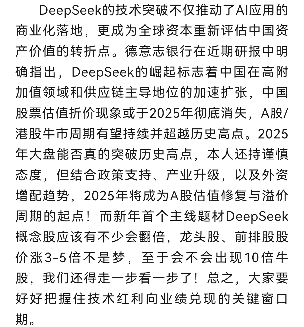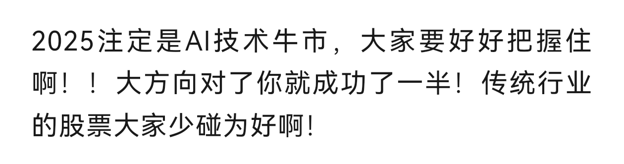 前段时间,本人连续写了多篇关于“AI牛市”的文章了,大方向预判是对的!周末大家有时间,可以重温过去文章的经典段落!2025年02月09日,《AI技术驱动下的投资机遇》的文章截图: