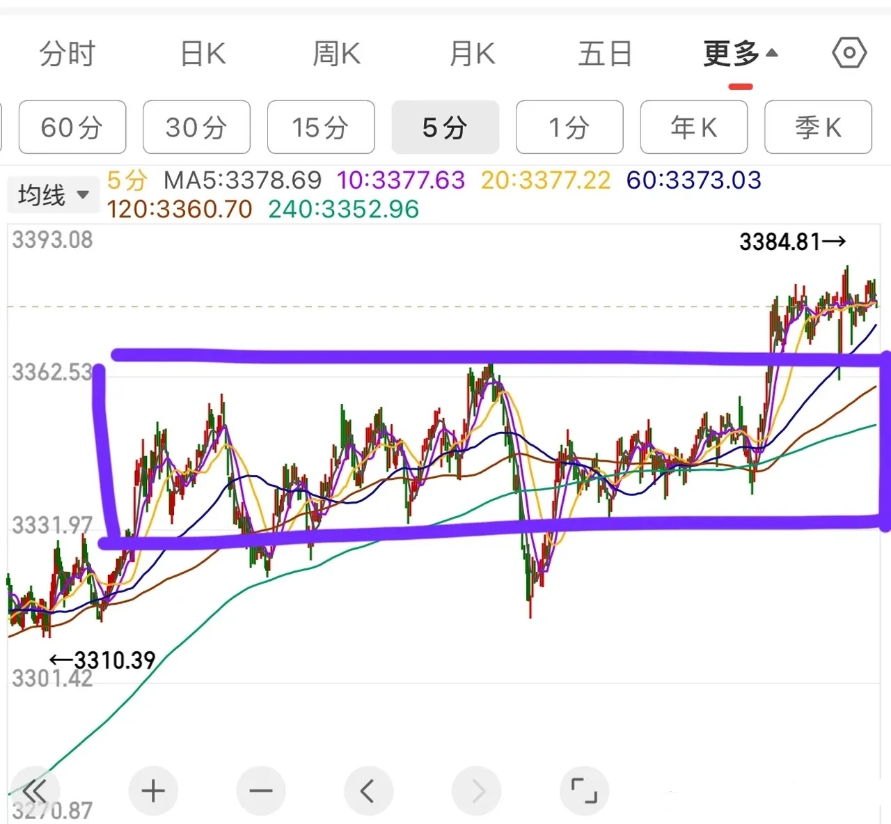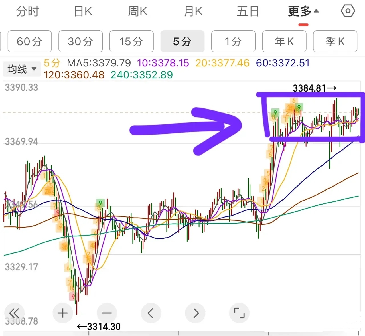 大盘这个位置需要注意的是,如果不能快速脱离这个中枢,与3366拉开不了距离的话,很容易背驰掉,一方面要以小平台中枢做好防守(3367),另一方面要关注多头的力度,如果往上力度不足,高抛做T,适当注意一下仓位来应对。