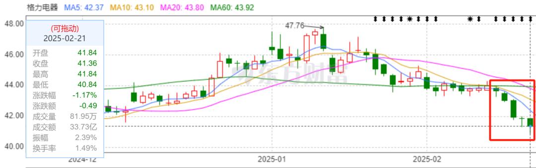 消息传出后,格力电器股价遭遇五连跌,其中2月18日和19日分别下跌1.47%和2.53%。进入2025年格力电器股价已经下跌10.4%。2024年格力电器股价表现不俗,全年涨幅达52.6%。但进入2025年股价却出现下探。和高峰值股价相比也下跌了30%,市值蒸发近千亿。