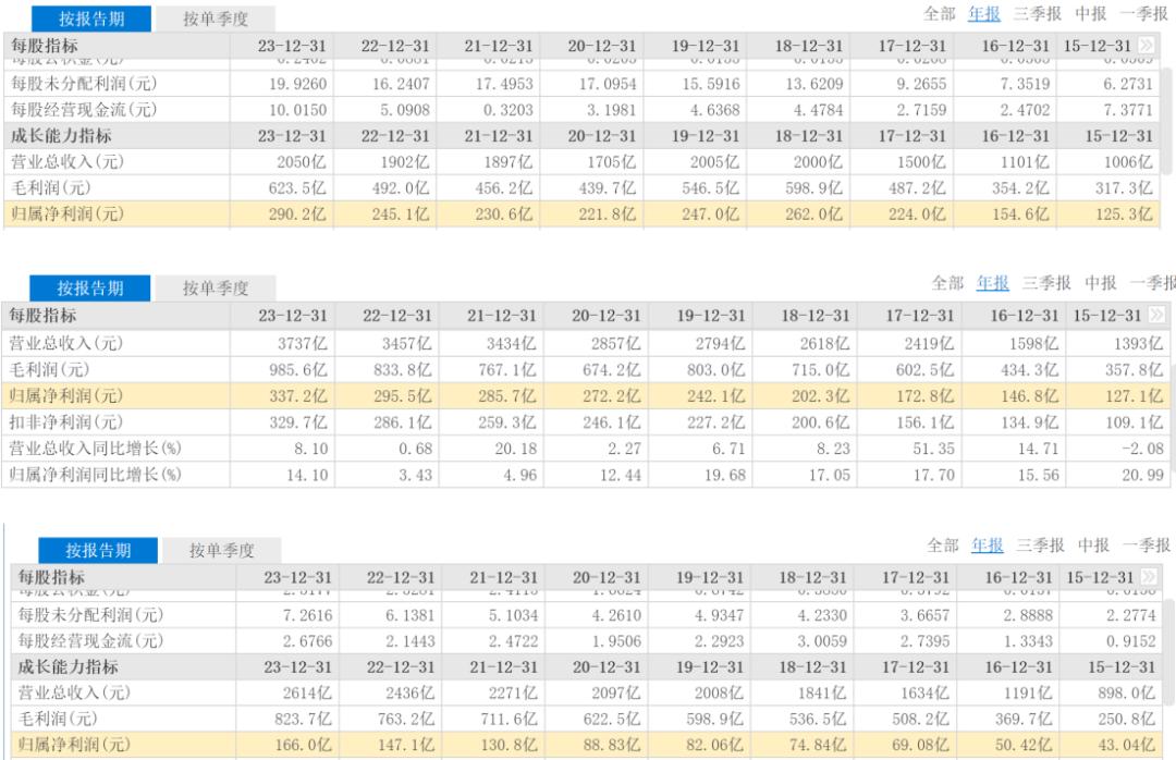海尔智家此前一直是三强中的末位,在2019年以前,海尔营收一直是三强中垫底,甚至净利润也只有美的和格力的三分之一左右。但在2019年海尔营收完成了对格力的反超,这一年海尔营收2008亿元,格力营收2005亿元。截至2023年,格力营收2050亿元,美的营收3737亿元,海尔营收2614亿元,格力“逆袭”成三强中的末位。