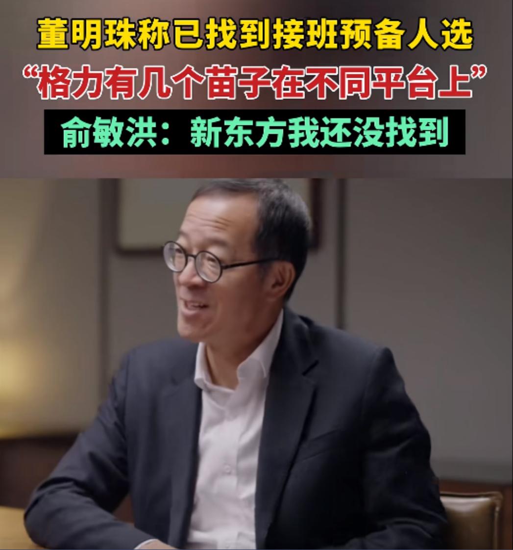 2月20日,《酌见》发布的一段视频引发广泛关注,视频为董明珠和俞敏洪的对话,董明珠说已经找到三四个备选接班人,而俞敏洪则表示了羡慕,称新东方目前还没有找到接班人。董明珠则表示自己已经找了几个苗子,在不同的平台和不同的岗位,并称关键要有一个人出来。