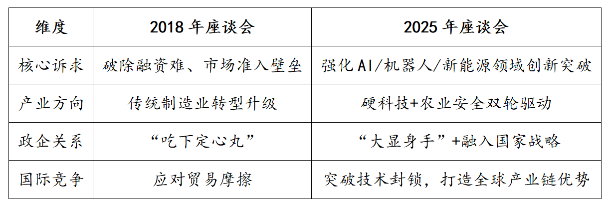 1. 历史定位:继2018年座谈会后,此次会议直面“改革发展与产业转型中的局部性、暂时性困难”,恰逢DeepSeek、宇树科技等硬科技民企全球出圈,亟需通过制度保障巩固创新动能。
