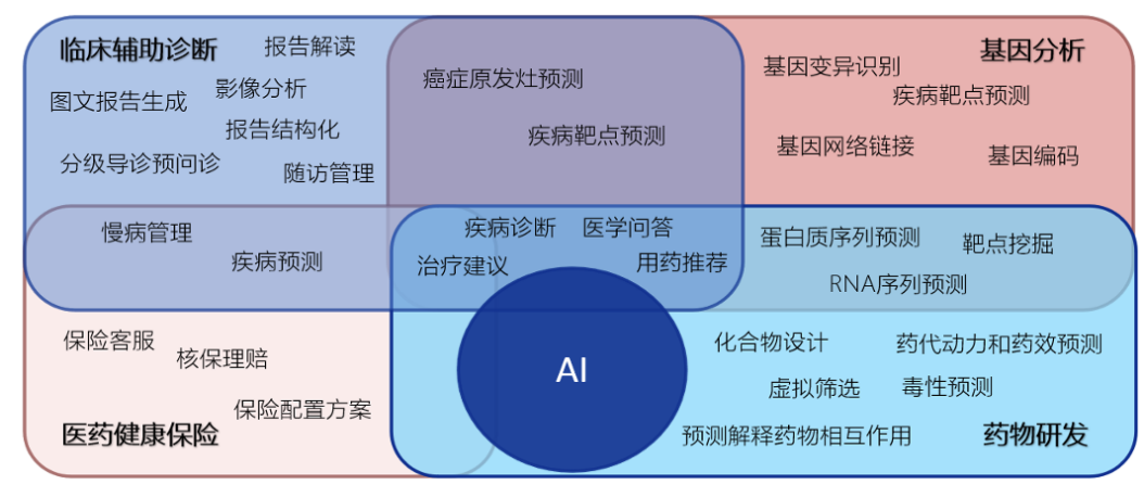 3)AI基因检测:基因组学分析方面通过AI能够加速生物信息学分析,缩短基因数据解读时间,以及通过大规模基因组数据识别与疾病相关的遗传标记,为治疗方案的个性化定制提供依据。