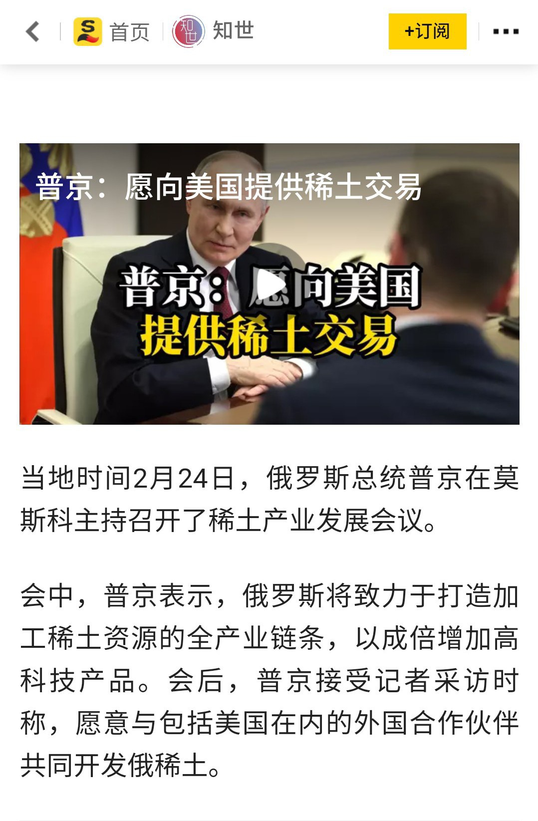 $北方稀土(SH600111)$ 当地时间2月24日,俄罗斯总统普京在莫斯科主持召开了稀土产业发展会议。会中,普京表示,俄罗斯将致力于打造加工稀土资源的全产业链条,以成倍增加高科技产品。会后,普京接受记者采访时称,愿意与包括美国在内的外国合作伙伴共同开发俄稀土。“我想强调的是,我们的此类资源肯定比乌克兰多一个数量级。俄罗斯在稀有金属和稀土储量上是无可争议的领先者。”普京说,俄方准备在“所谓的新的历史领土”吸引外国合作伙伴,也包括美国。