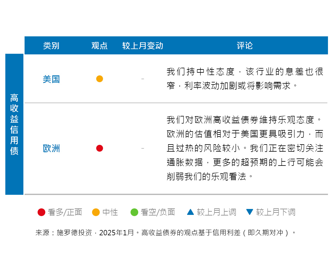 我们继续看好欧洲高收益债券,欧洲的估值相对于美国更具吸引力,而且过热的风险较小。我们正密切关注通胀数据,更多的超预期的上行可能会削弱我们的乐观看法。