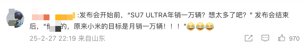 值得注意的是,2月26日上午,雷军曾发文称,小米SU7 Ultra产品力很强,团队信心十足,对于1万台的全年销量目标,已有九成把握。彼时评论区还有质疑的声音,而在2月27日发布会之后,不少网友表示最新曝光的价格太“炸裂”了,有的网友迅速晒出了订单,还有网友认为1万台的年销量目标保守了。
