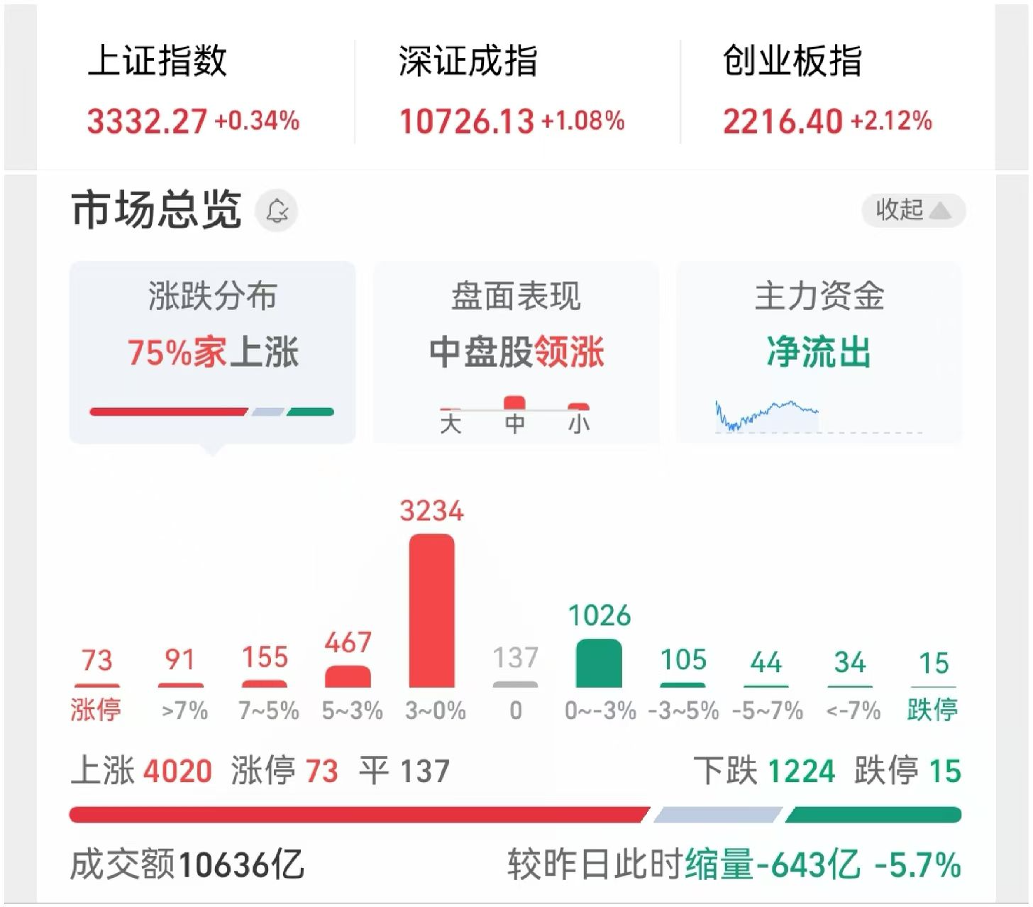午评:三大指数早盘反弹修复,午间收盘上证收涨0.34%,创指收涨2.12%,深成指涨1.08% 沪深两市半日成交10636亿,较上个交易日缩量643亿。个股涨多跌少,两市4020只个股翻红,1224只个股收绿