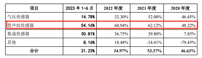 分传感器类型看,典型如收入巅峰的2021年,声学传感器综合毛利率约为19.95%,而其他传感器对应毛利率高达53.37%,尽管2022和2023上半年,因其他传感器营收规模大幅缩水导致毛利率骤降,但依然高于声学传感器。其他类型传感器中,骨纹传感器又是绝对的高毛利产品,毛利率在50%以上。