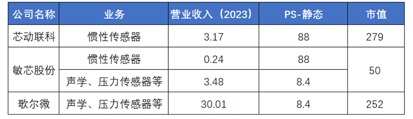 以业务更单一的芯动联科为起点,假定拥有芯片自研能力的惯性传感器企业的PS普遍为88倍,那么,敏芯股份2023年0.24亿元的惯性传感器收入对应PS估值为21亿元。由于敏芯股份目前A股总市值约为50亿元,那么在剔除惯性传感器业务21亿元估值后,其声学、压力传感器业务累计估值29亿元,两项业务对应的PS即8.4倍。