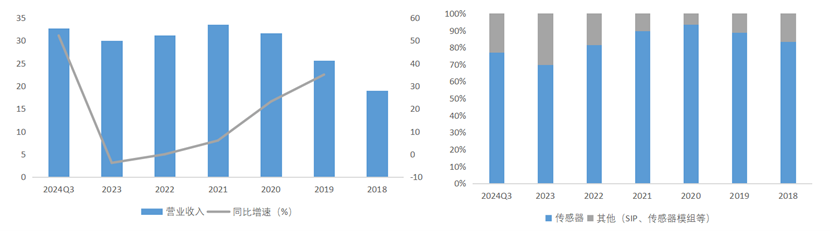 分产品看,MEMS传感器占据公司大部分的营收,2021年歌尔微传感器业务约为29.99亿元,占总营收比例约为90%;2023年传感器业务营收20.92亿元,占比69.7%;2024年前三季度,歌尔微传感器收入同增66.89%至25.15亿元,占总营收比例为77%。
