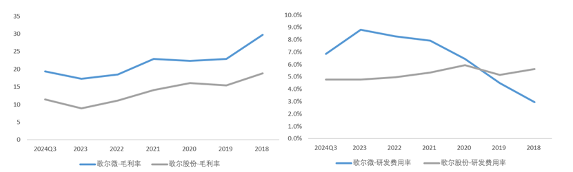 2022/2023/2024Q3,歌尔微的毛利率分别为18.5%、17.23%、19.41%,长期处于20%以下,虽高于申万消费电子指数平均11.95%的毛利率,国内规模以上制造业平均约15%的毛利率,但低于申万半导体指数平均26.53%的毛利率。