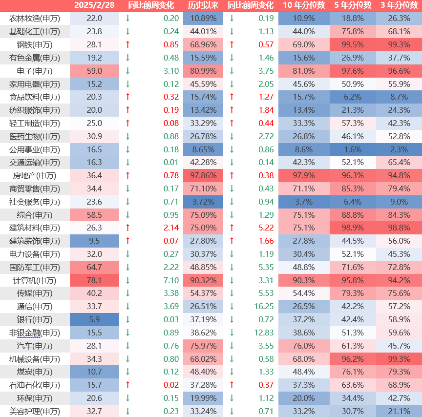 上周各宽基指数和行业指数估值多数下行。当前各主要宽基指数估值水平,较多在历史50%分位数以下,未来仍有一定估值提升空间。从行业板块看,上周建筑材料、钢铁、当地产估值上行最多,计算机、通信、传媒下行最多。当前房地产、计算机、电子、汽车、建筑材料板块估值处于历史较高水平;社会服务、公用事业、农林牧渔、纺织服饰、有色金属板块估值处于历史较低水平。