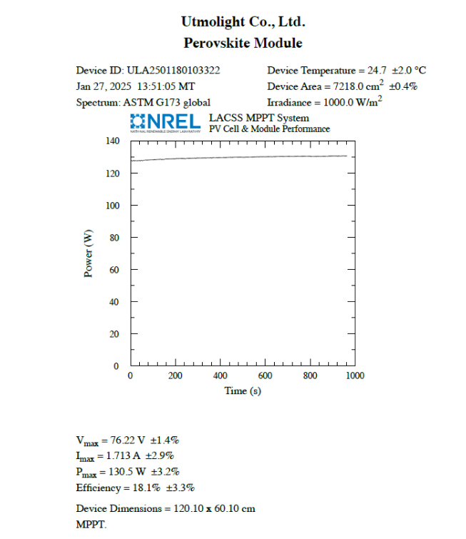 近日,全球光伏领域迎来全新突破——经美国国家可再生能源实验室(NREL)权威测试,极电光能150MW中试线生产的0.72m钙钛矿光伏组件在MPPT的严格测试中实现超过950秒零衰减,全面积稳态效率达到18.1%(对应功率130.5W),刷新平米级尺寸钙钛矿组件效率的全球最高纪录。这一成就不仅彰显了极电光能钙钛矿产业化技术的绝对领先性,更以可交付的量产工艺实力,向全球证明了钙钛矿光伏技术大规模商业化的可行性。