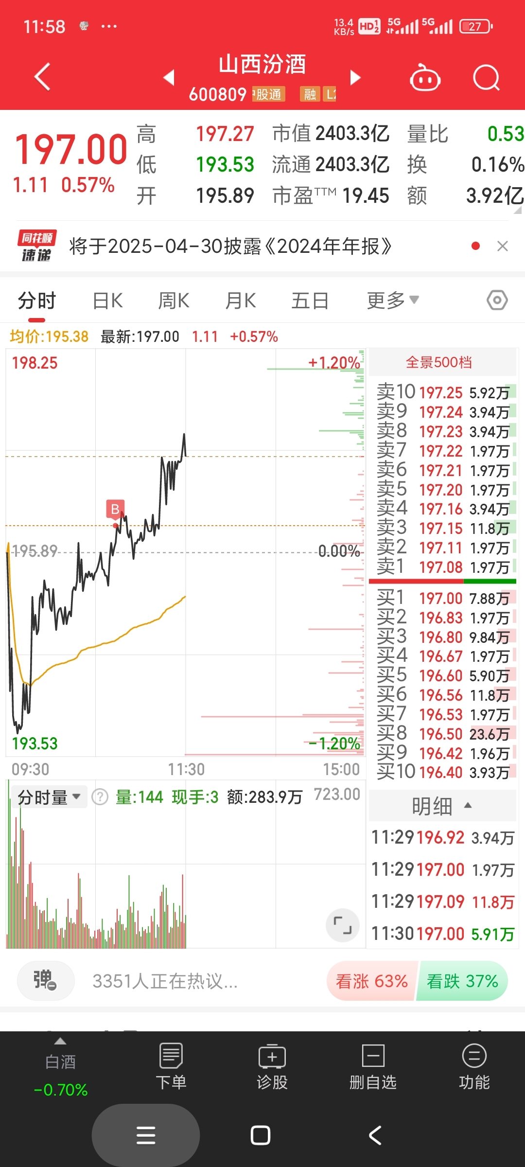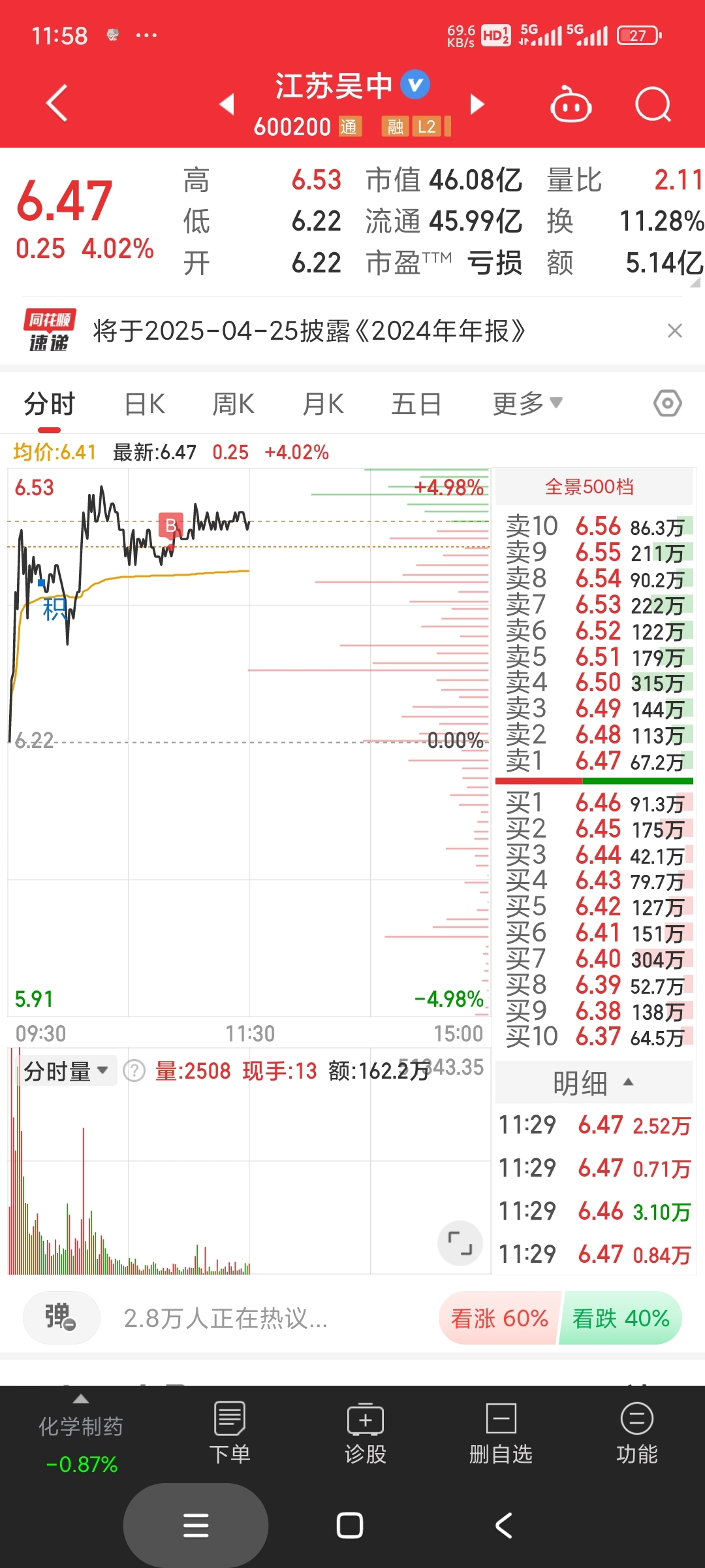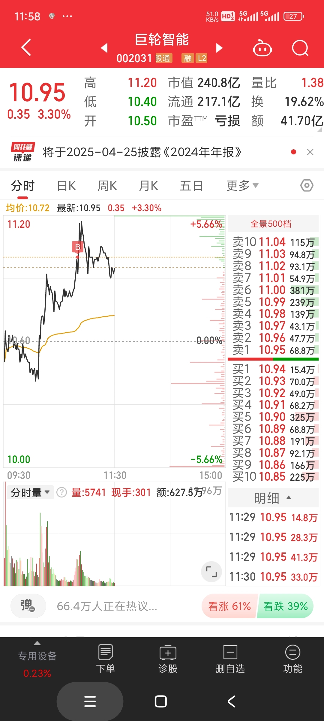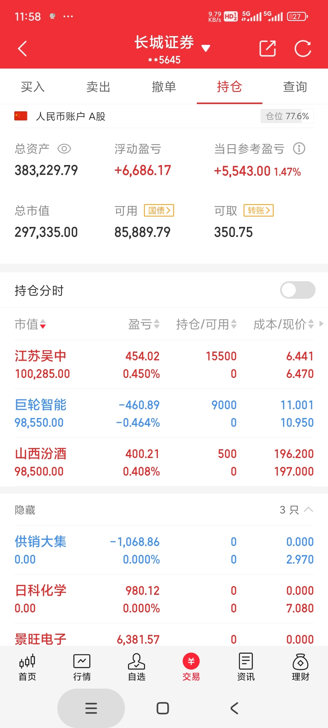 10.07分左右机器人跟大盘共振拉升,就买了个巨轮,其他买了个防守山西汾酒跟超跌的江苏吴中,还剩点仓位准备等巨轮均线再买。如果机器人下午崩盘就不补了。