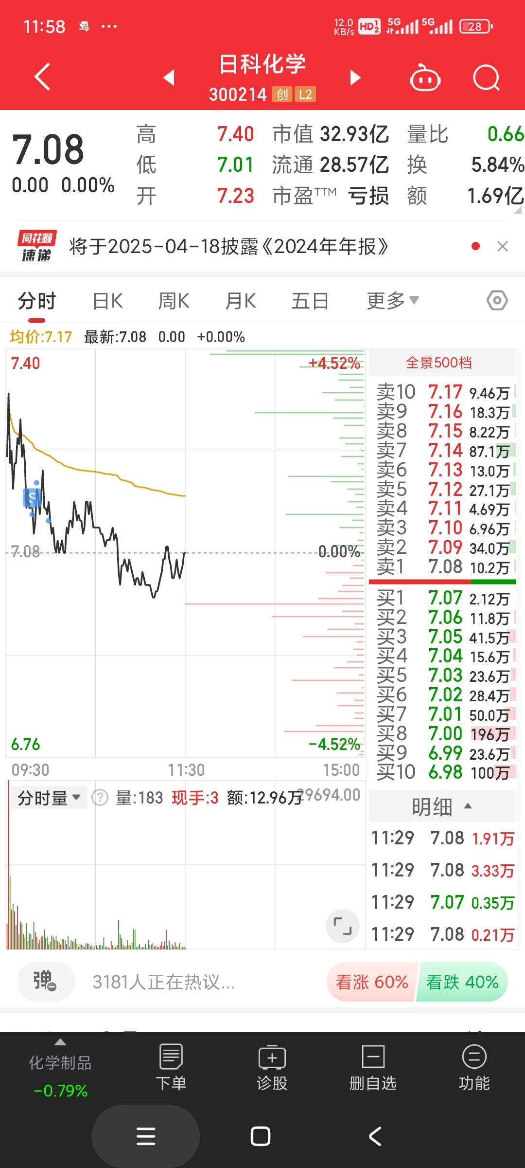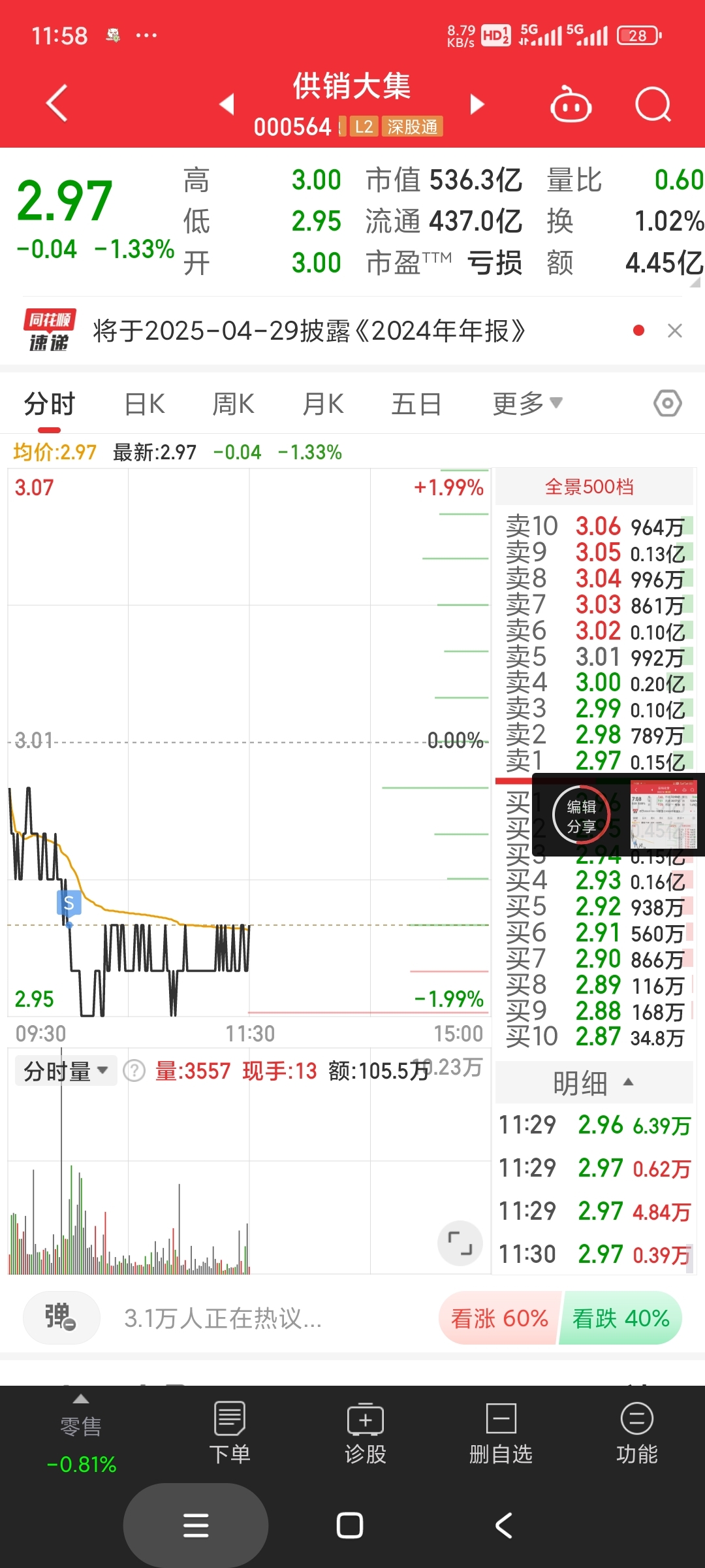 早上冲高只出了个景旺电子半仓,300的日科4个点没舍得卖,以为还能冲一下,结果大盘越走越弱,红盘家数越来越少,最后全部清仓,供销大集小亏清了。