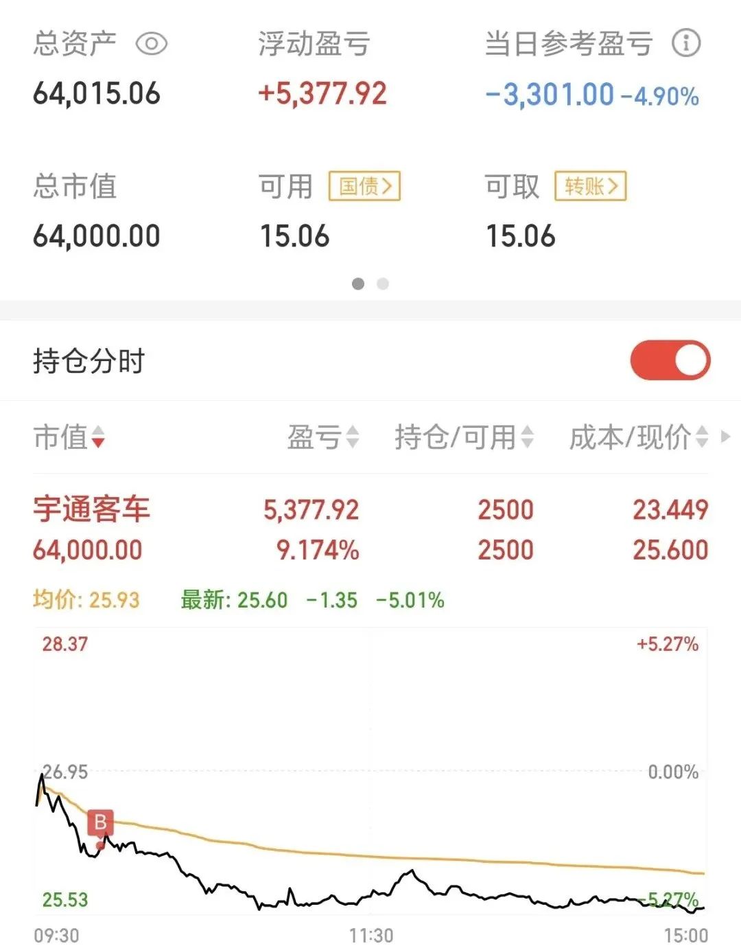 自2024年12月份建立高息养老小账户以来,6万本金至今共盈利4015元,收益率6.69%,总资产64015元。(2025年1月10日持仓宇通客车2200股,成本价25.746元每股;今天持仓宇通客车2500股,成本价23.449元每股)