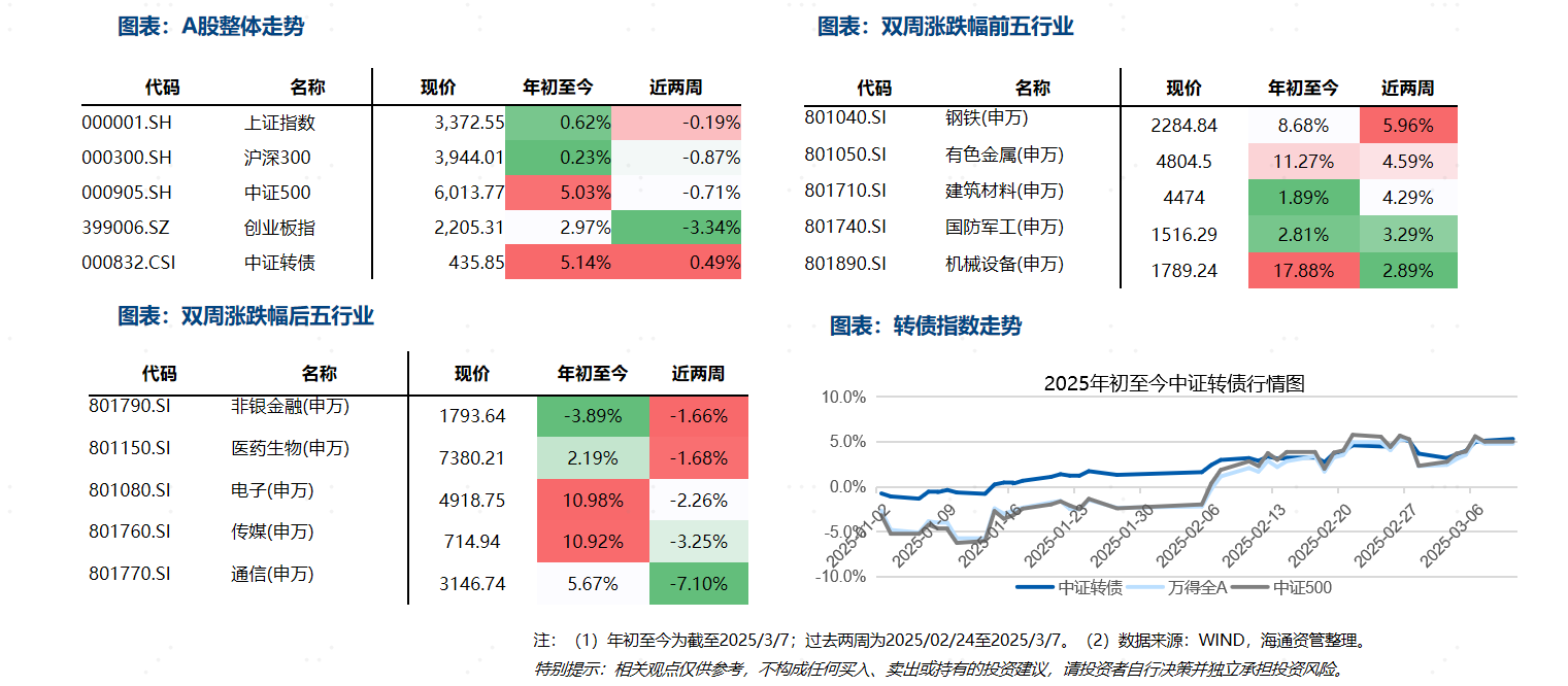 近两周,海外方面美国衰退预期升温,特朗普政府一系列新政(削减财政支出、DOGE裁员、关税等)对未来经济增长和通胀的影响的不确定性抬升。国内方面,全国两会召开,总量上的政策整体符合市场预期,短期或延续强势震荡。板块表现方面,钢铁、有色金属、建筑材料、国防军工和机械设备涨幅靠前。非银金融、医药生物、电子、传媒和通信表现落后。A股:从行业表现看,由于市场震荡调整和全国两会召开,顺周期和红利资产最近两周表现占优,前期涨幅较高的TMT回调,通信因大模型进步引发的算力担忧短期回调较多。年初至今则仍是科技行业表现较好,且有扩散趋势,周期红利资产领跌。