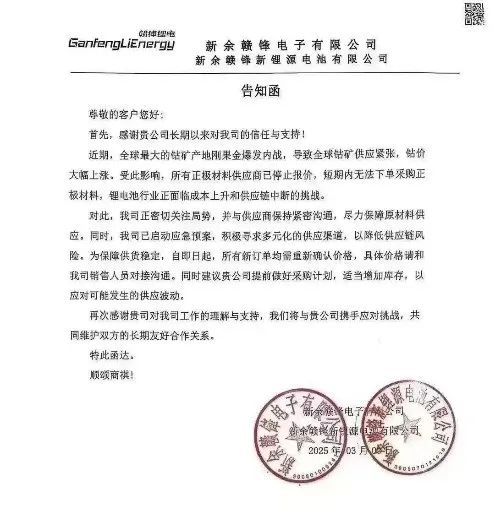 近日,一份据传源自赣锋锂业下属子公司的告知函在行业内引起了广泛关注。告知函中指出,全球钴矿供应紧张,钴价大幅上涨...自即日起,所有新订单均需重新确认价格。截至目前,赣锋锂业作为相关方尚未对此消息作出正式回应,但这一市场传闻的沸沸扬扬,已带动整个行业开始深入审视整个锂电产业链的韧性。