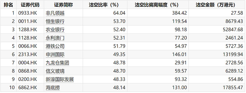 从沽空比率来看,共59只个股沽空比率超30%,非凡领越、恒生银行、农业银行位居前三,分别为64.04%、53.7%、52.4%。