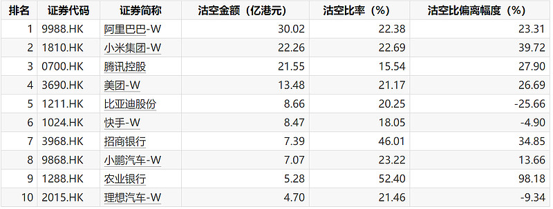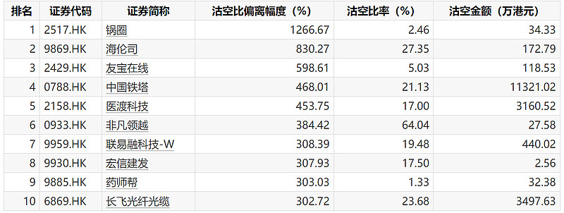 3月13日港股沽空比率偏离幅度排行: