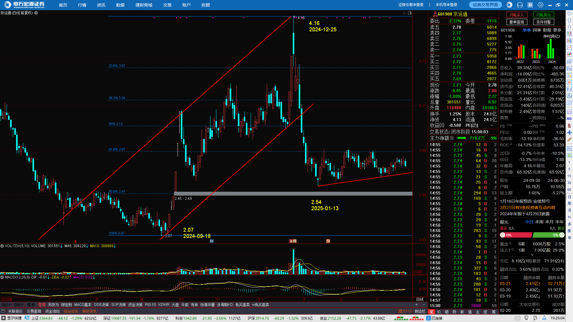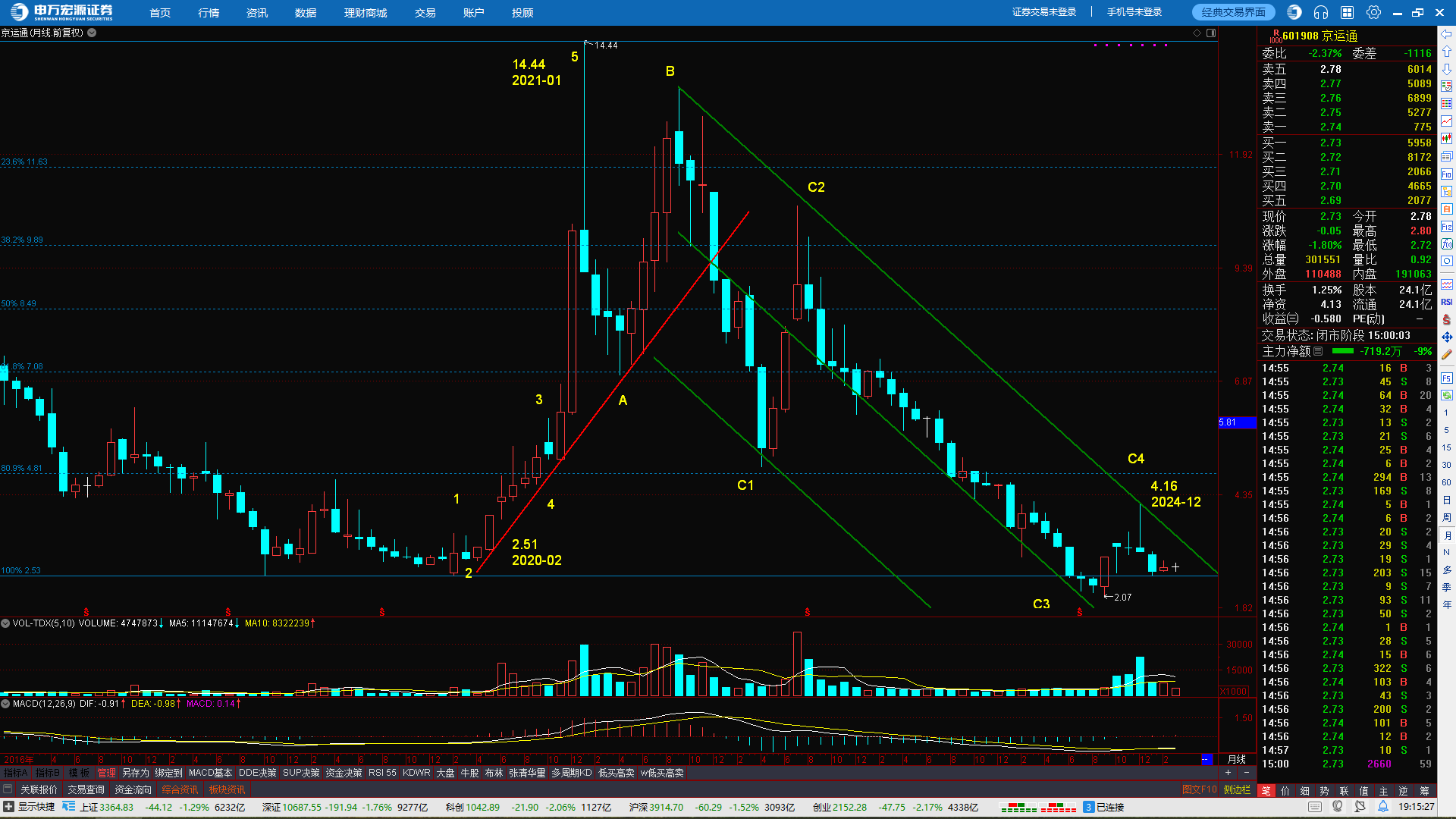 波浪结构上看,从短线顶部4.16急跌到图中标注的今年1月13日的低点2.54,是一个明晰的五浪下跌结构。此后的股价运行,受2.54以来的红色上涨趋势线的支撑,但是也受图中61.8%黄金分割线2.67的压制。这组黄金分割线,分割了C4浪的反弹涨幅,可以预测C5浪的下跌进程。