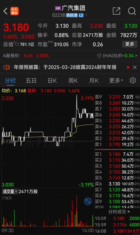 截至3月26日收盘,广汽集团A股股价报8.65元/股,涨幅达2.85%;港股股价报3.18港元/股,涨幅达1.6%。