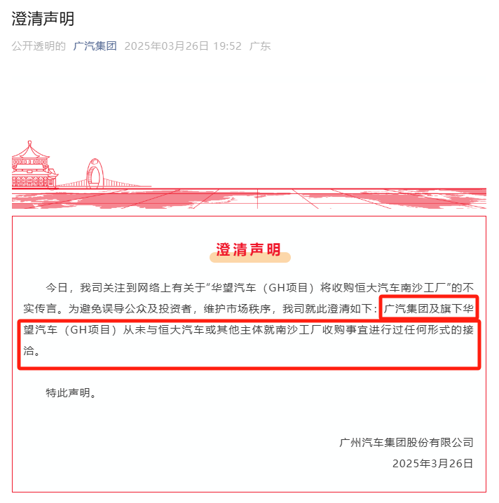 3月26日晚间,广汽集团发布澄清声明称,广汽集团及旗下华望汽车技术(广州)有限公司(以下简称华望汽车,系GH项目公司),从未与恒大汽车或其他主体就南沙工厂收购事宜进行过任何形式的接洽。