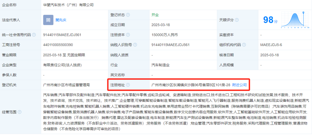 天眼查显示,广汽集团在3月18日投资成立华望汽车,注册地址为广州市南沙区东涌镇庆沙路96号首层B区101房-28。