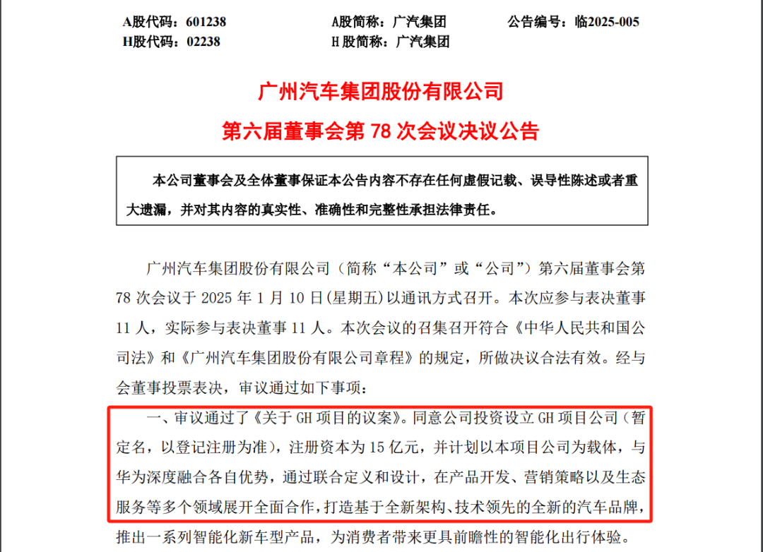 1月10日,广汽集团董事会审议通过议案,同意公司投资设立GH项目公司(暂定名),并计划以GH项目公司为载体,与华为合作打造全新的汽车品牌。
