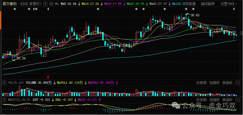 $歌尔股份(SZ002241)$ ">$歌尔股份(SZ002241)$ (002241)苹果概念,国产芯片。今天这走势,一点都不奇怪,这大盘跌了,个股要是强势,反而有点反常。个股是偏依赖苹果的,但是目前公司也是在积极拓展客户的。或许诸君疑惑为啥不走,这都看不到涨势,拿着就很难受。非也,也不是说非常自信。主要是从以下几点去看的,首先个股的相关板块和题材已经深度回调,个股也是这样,现在题材轮动主要还是集中在科技线上。其次持续下跌中绿柱收缩,股价没偏离均线轨道太多。