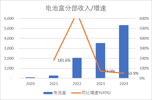 和其它大部分汽零公司一样,敏实也是受益于国内新能源车崛起的利好。与此同时,敏实也找到了汽车装饰件之外的另一个业绩增长点——电池盒业务。2024年全年,电池盒业务收入达到53.4亿元,同比+50.9%,占收比贡献从17.2%上升到23.1%。