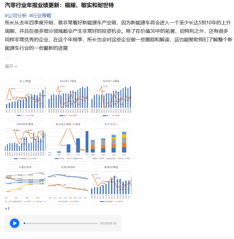 所长从去年四季度开始就非常看好新能源车产业链,因为新能源车将会进入一个至少长达5到10年的上升周期,很多细分领域都会产生非常好的投资机会。除了价值30中的拓普、伯特利之外,还有很多同样非常优秀的企业,在这个年报季,所长也会对这些企业进行跟踪和解读,这也能帮助我们了解整个新能源车行业的一些最新进展。