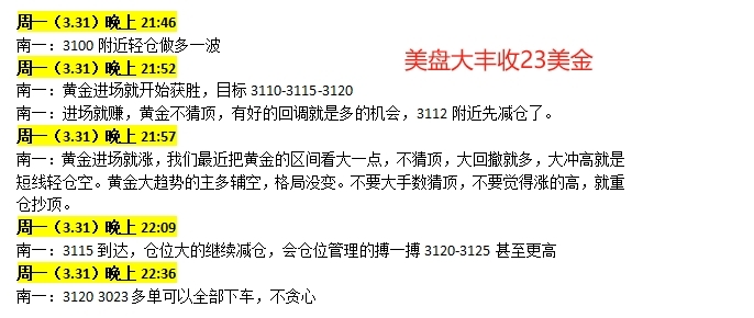 昨日的节奏尽在南一掌握之中。欧盘时段,南一在3123点位附近公开给出做空思路,南下至3112时,及时提示减仓,精准落袋11美金。进入美盘,市场波动加剧,调整思路,在3100附近果断反手做多,高抛低吸,抓住每一个机会。涨至3123,提示全部下车。截至目前,轻松落袋34美金,持续获胜中,就问你大口吃肉的感觉怎么样?相信南一,坚定南一,只干实事,不是无脑涨跌!!