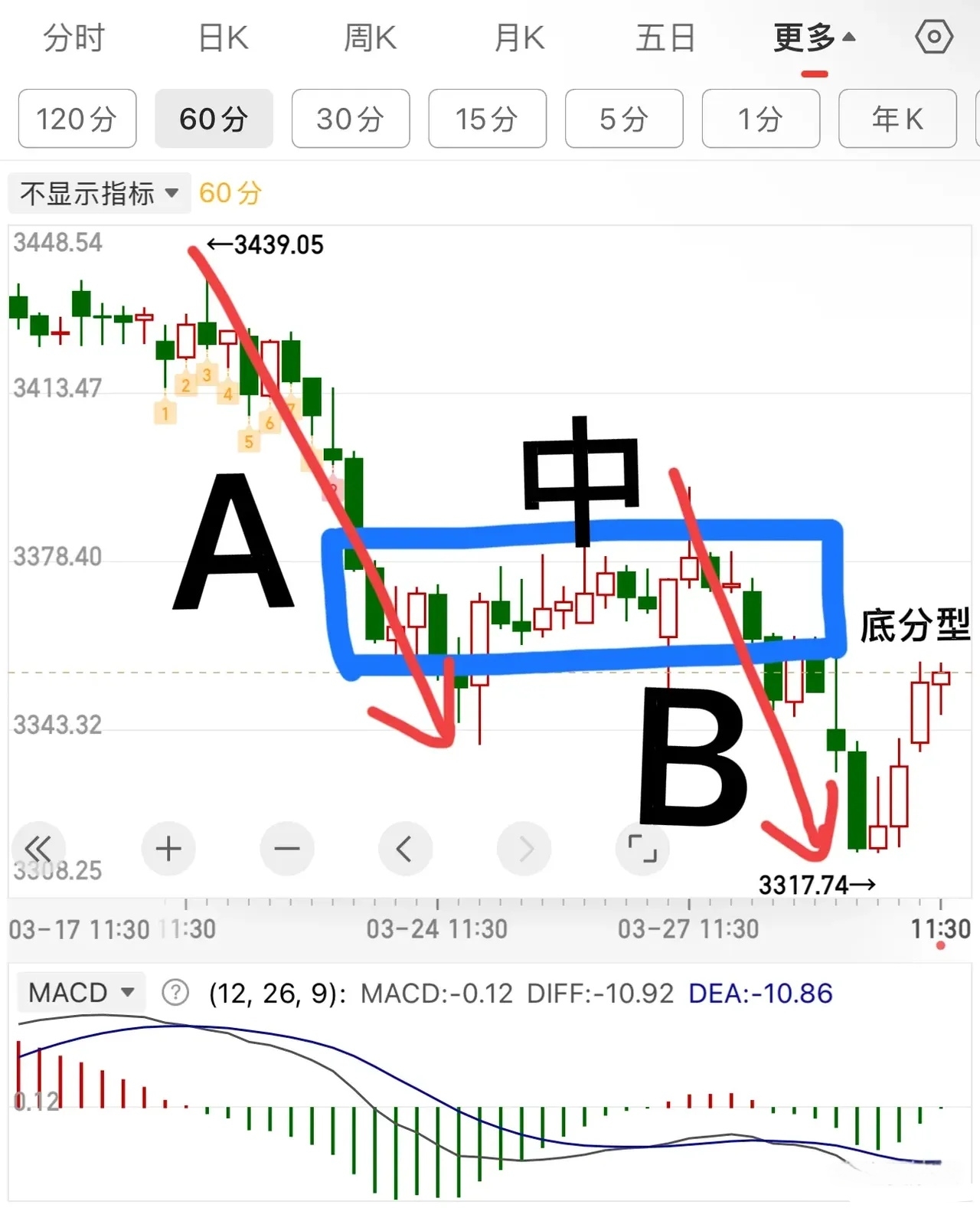 走势结构上,图4,以中枢为参照物,比较前后两段力度,B弱于A则有条件背驰回拉中中枢,稳健的看60分钟底分型,60分钟底分型昨天出现,但并不强,核心还是量,但这个底分型意味着短线有止跌反弹的意味,相对的操作上,就会比之前的好做很多。所以如果仓位轻的,可以利用回调,找机会低吸,短线为主,但不可追涨,注意节奏。