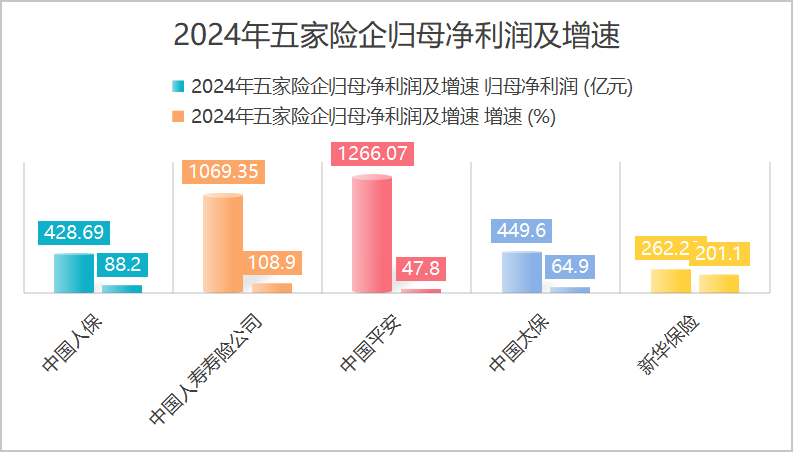 根据A股五家上市险企2024年年报数据,中国人保、中国人寿寿险公司、中国平安、中国太保、新华保险共取得归母净利润3475.71亿元,较上年同期增长77.7%。