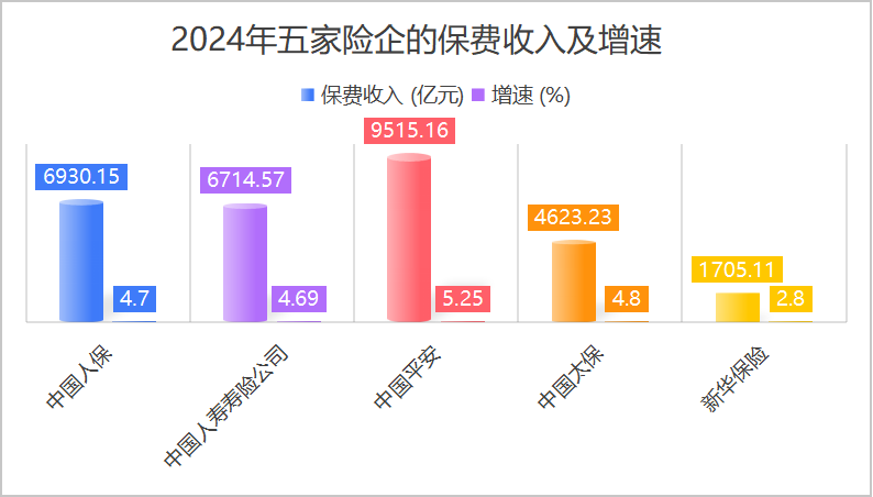 2024年,五大险企的保费收入增速差异明显,呈现出“强者恒强”的格局。中国平安的保费收入为9515.16亿元,同比增长5.25%。这一增速在行业中居于较高水平,显示出中国平安在健康险领域的战略优势。