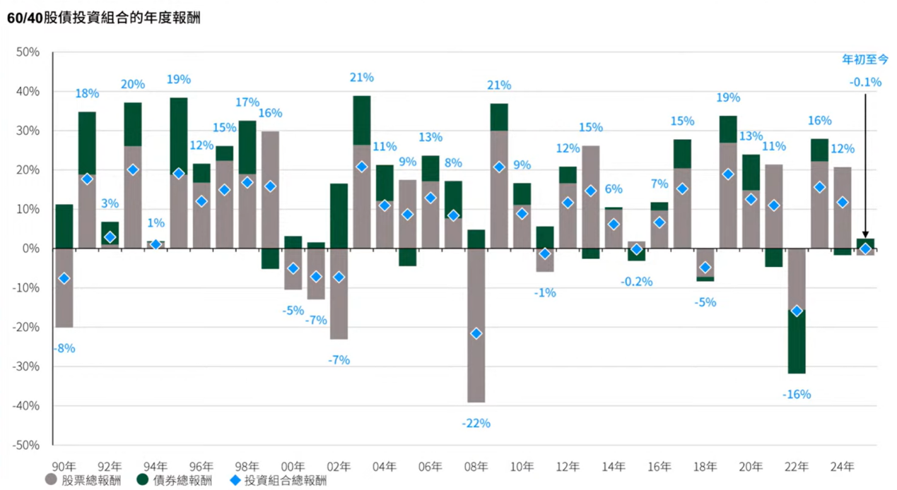 这时我又要祭出这张图:如果按照“美股6美债4”的配置来看,今年只会跌-0.1%。