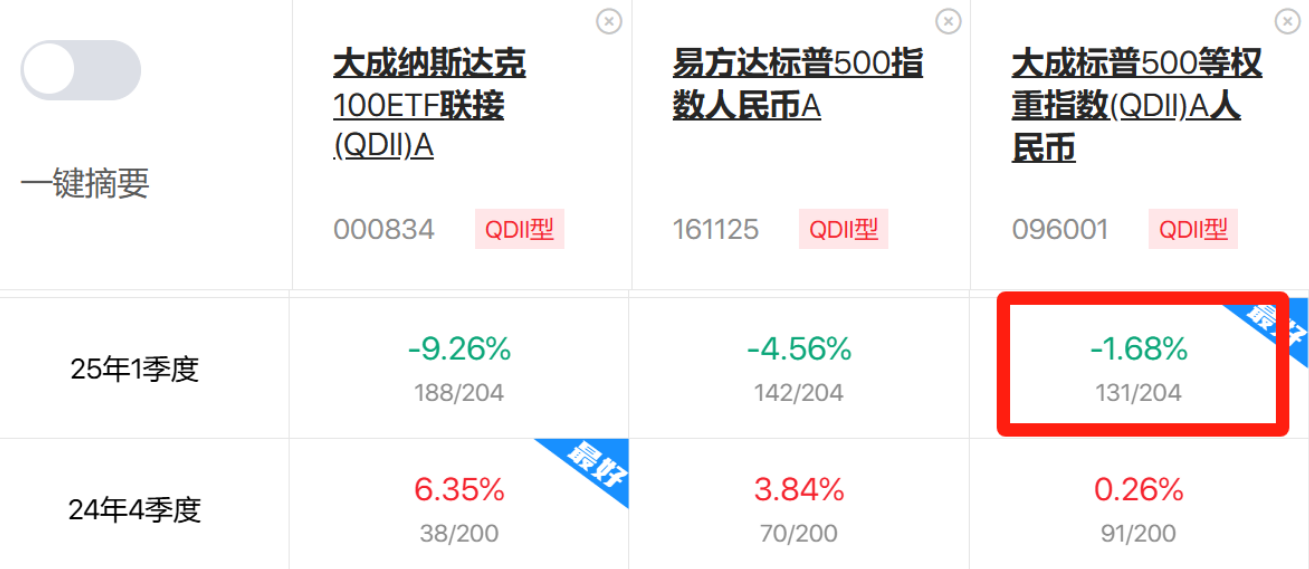 今年最抗跌的是$大成标普500等权重指数(QDII)C人民币(OTCFUND|008401)$,Q1只跌了-1.68%