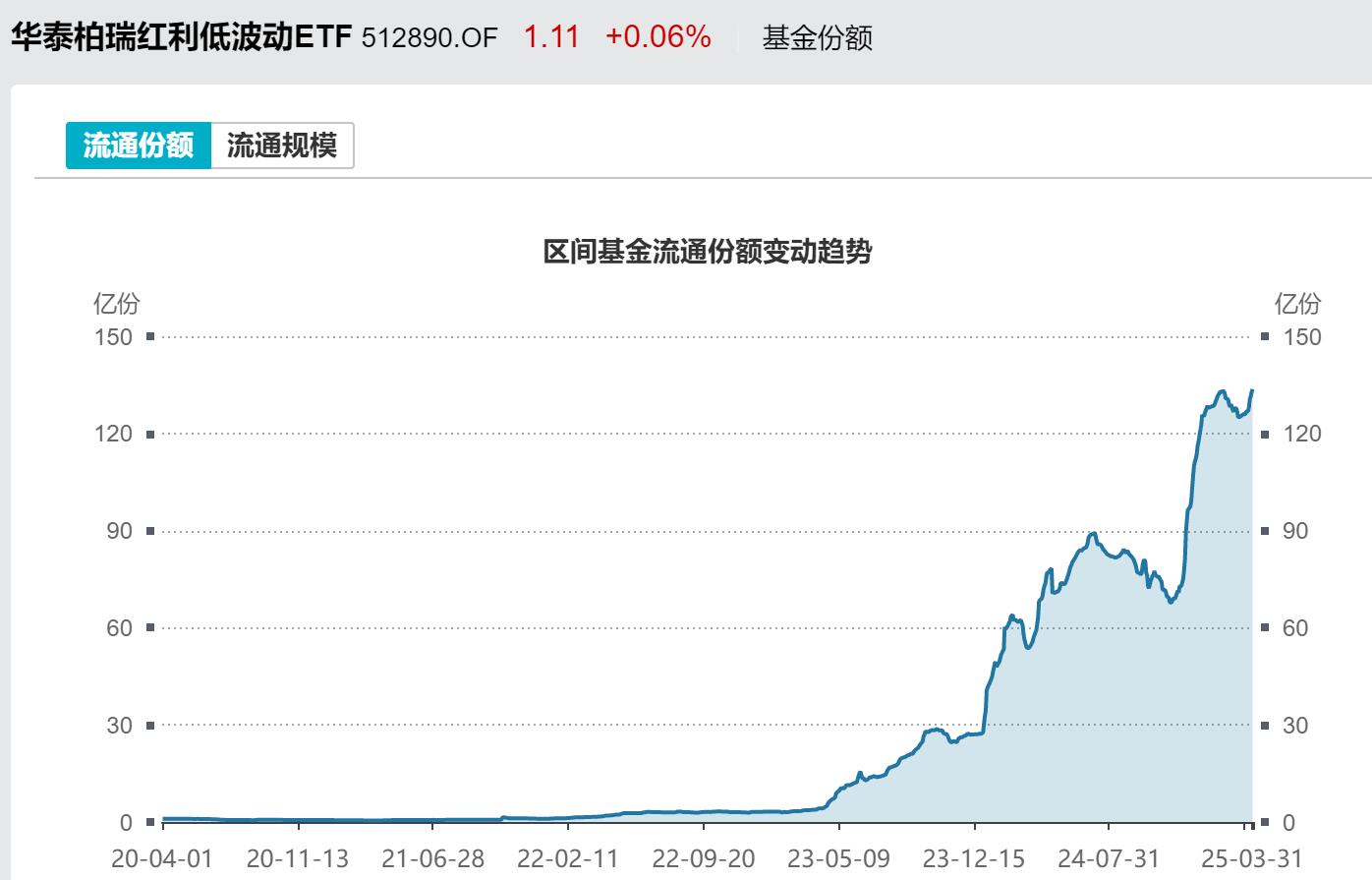 在2月18日文章《一个耐人寻味的现象》中,我提到各大宽基ETF的份额都在减少,资金一直在赎回。而今天我们聊的这个红利低波ETF(512890)刚好相反,它的份额一直在增加,很多资金在申购。截至2025年3月31日,它的规模已经突破148亿。