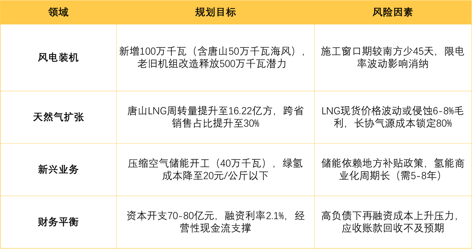 • 运营风险:老旧风场改造进度不及预期(需电网消纳条件配合);唐山LNG项目产能释放滞后(施工窗口期较南方少45天)。