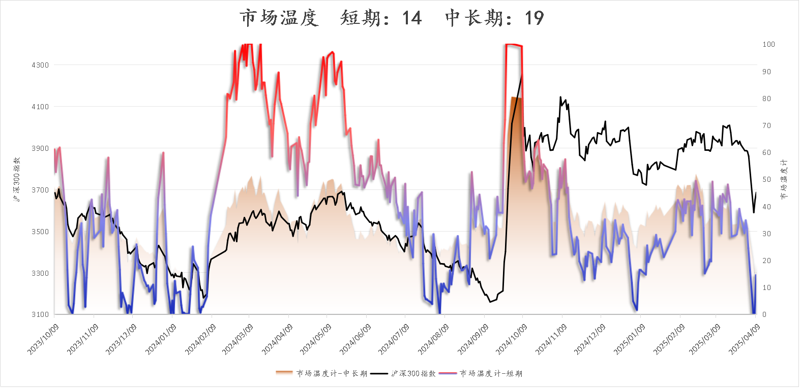 特别说明:市场温度计计算方式,采用6个每日高频指标过去一定期间的分位数作为市场情绪指标:期权波动率、风格因子、股指期货基差、融资净买入占比、股债回报差、创新高占比;市场温度计(中长期)时间周期为最近一年;市场温度计(短期)时间周期为最近100个交易日。市场温度最后结论会结合近期事件综合给出判断,包含一定的主观成分,仅供参考,不作为投资依据。