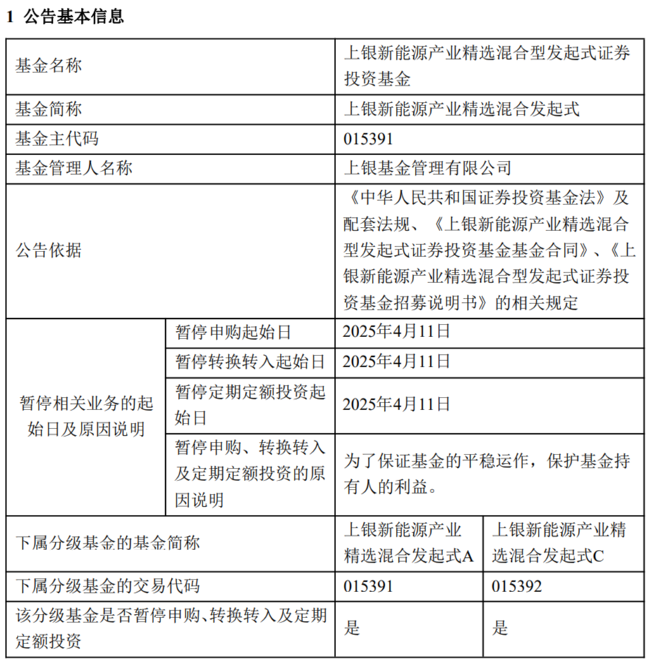 1、自2025年4月11日起,本公司将暂停上银新能源产业精选混合型发起式证券投资基金$上银新能源产业精选混合发起A(OTCFUND|015391)$$上银新能源产业精选混合发起C(OTCFUND|015392)$(以下简称“本基金”)的申购、转换转入及定期定额投资业务。