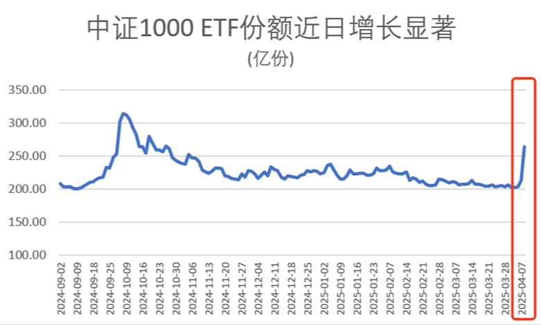 与4月7日仅有沪深300和中证500 ETF合计净流入超百亿元的情况相比,4月8日开始中证1000ETF也显著获得增持。仅4月8日单日,规模较大的三只中证1000ETF净申购额合计超过200亿元。“国家队”护盘下,中证1000出现大跌行情的概率降低。