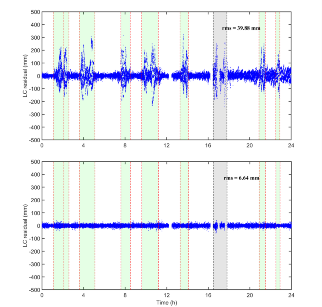 图5 HT1-A在没有机动处理的情况下(上图,绿色表示姿态机动,灰色表示轨道机动)和有机动处理的HT1-A的基于GPS的POD的定轨残差