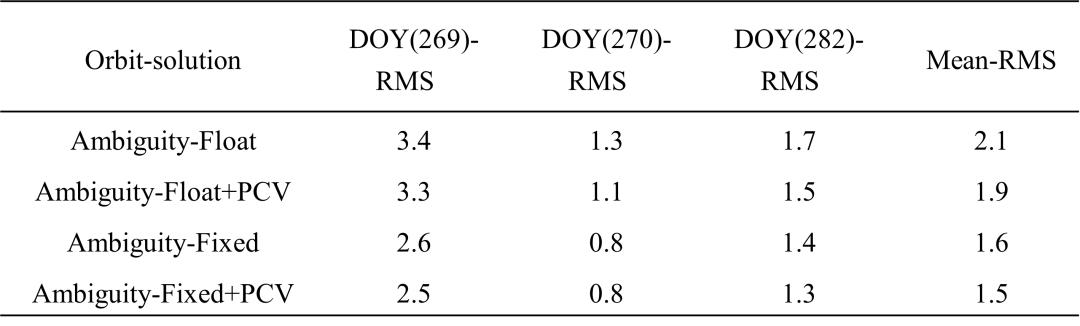 SLR是星载GNSS精密定轨的一种传统的精度检核方法。为了独立评估POD的性能,我们将获得的轨道解与来自长春站(ID:7237)的SLR数据进行了比较。我们使用了32个SLR观察正常点。图6显示了SLR验证的模糊度浮点解结果,三天内平均SLR残差为2.1cm。表1给出了HT1-A不同轨道解的SLR验证结果。