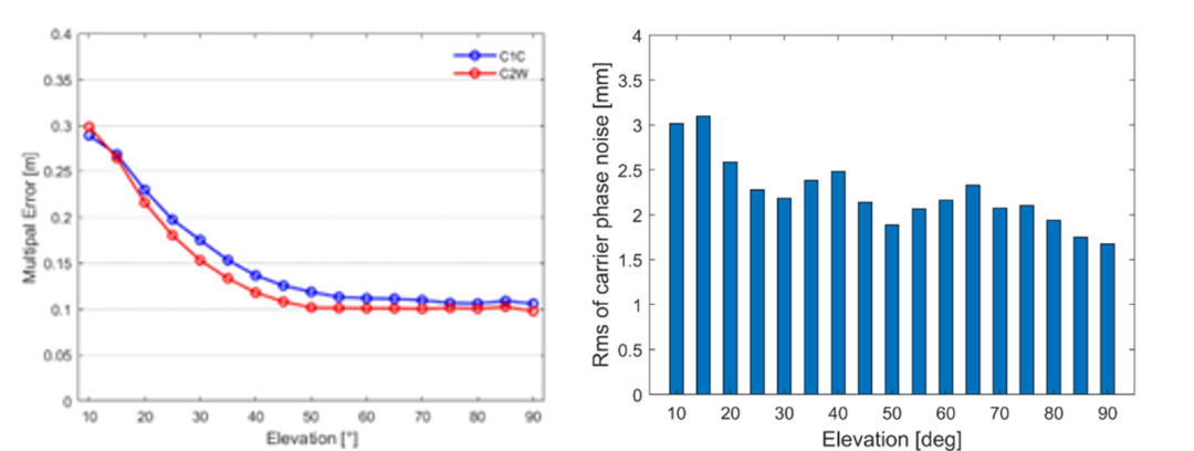 伪码多路径误差是由信号从发射机传播到接收机时来自周围环境的信号反射引起的。如图3(左)所示,伪码多路径误差在低高度角(<30)区域显著增大,是由于GNSS卫星处于快速上升或下降阶段时,信号更易受遮挡与反射影响。HT1-A卫星C1C与C2W伪码的多路径误差均方根(RMS)分别为0.21m与0.19m。图3(右)中显示了相位噪声与信号升高的关系。与伪码情况类似,相位噪声在较低的高度角下也更大,HT1-A的平均RMS为2.6mm。其他三颗辅助卫星(HT1-B/C/D)携带相同的GNSS接收机,且GNSS数据质量与HT1-A完全一致。