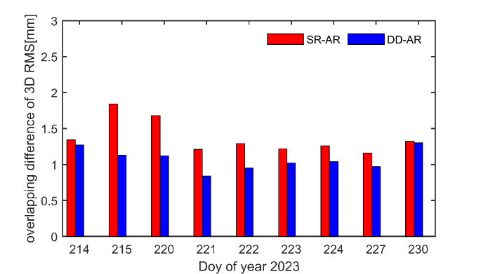 通过重叠弧段的比较,可以得出两个基线解的基线一致性相似。其中,更高层次的仍然是DD-AR方法,3D RMS的平均统计结果为1.07mm,因为它消除了大部分常见的误差项,并保留了共视GNSS卫星数据,这也是这种解决方案的优点。SR-AR的平均统计结果为1.23mm,也可以达到与DD-AR相同的数量级。对于编队卫星相距仅几百米的宏图一号星座,SR-AR和DD-AR方案都是可行的选择。我们认为,针对具有中短基线和相似轨道高度的低轨编队卫星,DD-AR模式下的多星整网能够带来基线确定的更高效率与精度。