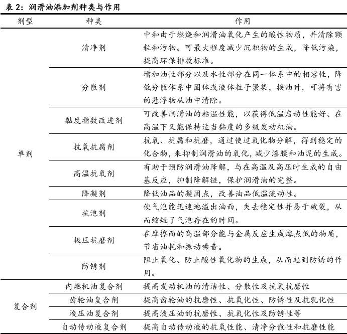 润滑剂可分为单剂和复合剂。单剂是润滑油添加剂按功能分类后具有单一特性的添加剂产品,包括清净剂、分散剂、黏度指数改进剂、抗氧抗腐剂、高温抗氧剂及其他类型。每种单剂都能满足润滑油生产商特定的需求;复合剂一般系由多种单剂按一定比例调配而成的混合物,具有多种特性,可明显提高内燃机油、齿轮油、液压油和自动传液油等润滑油油品性能并降低添加剂总用量,为各类机械和应用提供综合解决方案。润滑油单剂技术壁垒较低,但是复剂,因为需要内燃机的综合性能,所以壁垒很高,需要成千上万次的实验调配,去实验得到最优的组合。